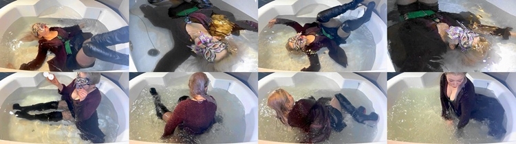 千花の脳内世界「沈む仮面」【溜まるまで…】からの続き。仮面を被って仰向けに沈む感覚を味わった後、ローションの素を入れて体でかき混ぜたりしてローション風呂を作っています。