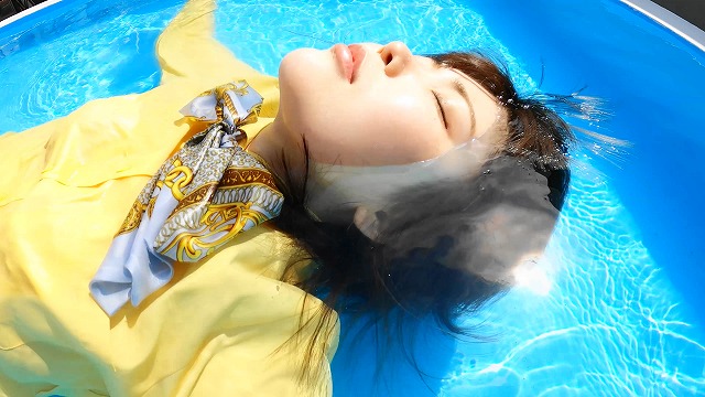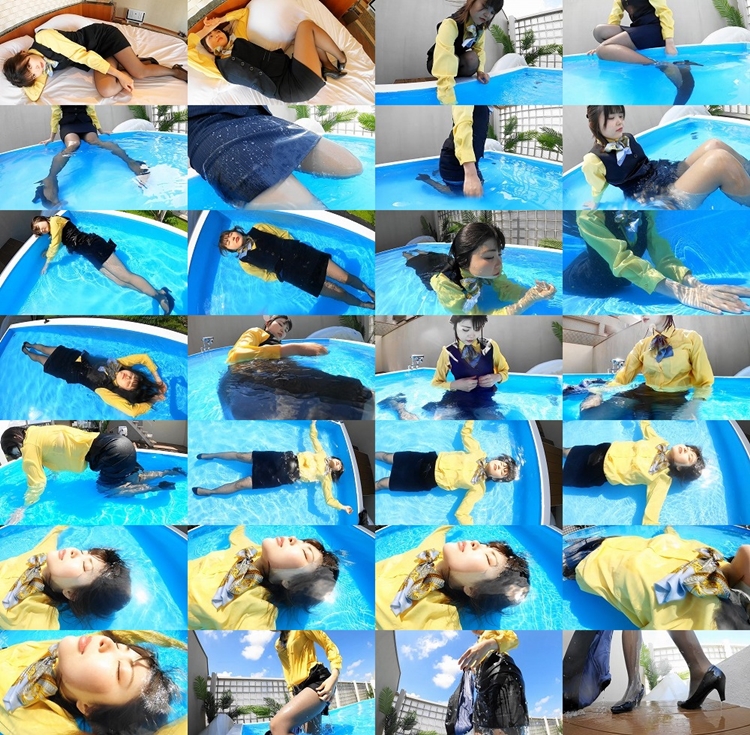 She is wearing a company uniform. She soaks in the pool in her company uniform. And she gets soaked all over.