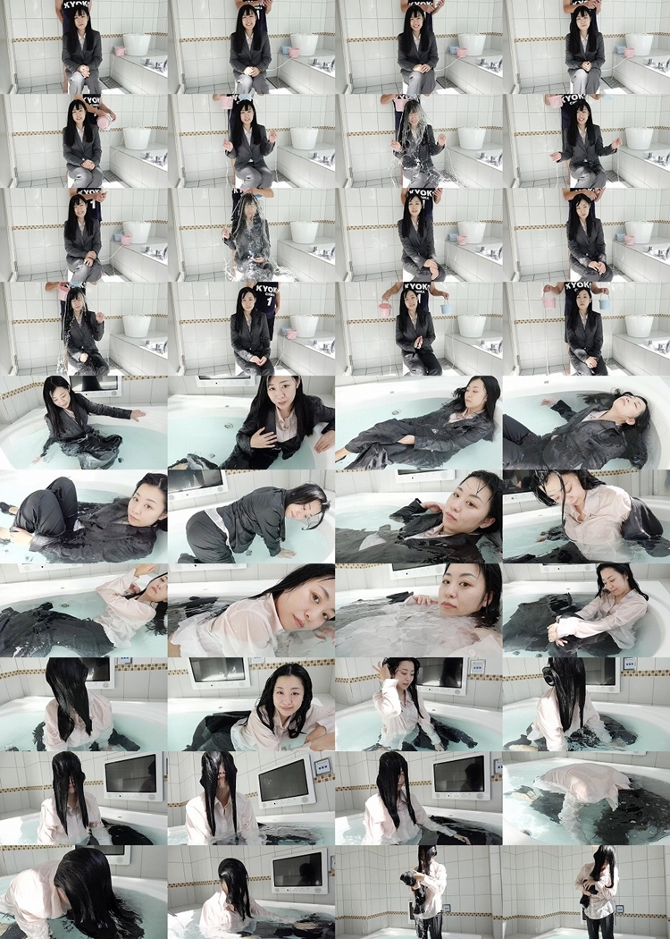 She is in a pantsuit. She showers with her clothes on and soaks in her bathtub. She gets soaked all over.