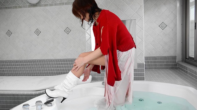 She is wearing a red sweater, long skirt and long boots. She soaks in the bathtub with her clothes on. And tear her sweater and long skirt. She tatters her clothes.