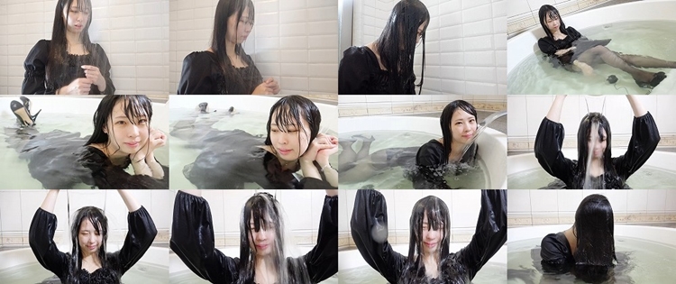 She is wearing a black dress. She takes a shower fully clothed. Then she gets in the bathtub. She is completely soaked.